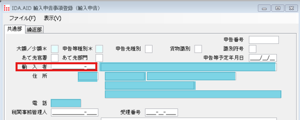 赤枠で囲まれた項目、ここはかつてJASTPROコードをそのまま入力する欄でした。コードを入力すれば、申告データ登録時に社名・住所・郵便番号・電話番号が自動補完され、スペルミスだけでなく、輸入者取り違えなどの人為的ミスが無くせるわけです。