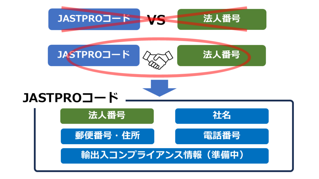 つまり、JASTPROコードは法人番号と対立する性質のものではなく、「輸出入申告に必要な事業者に関連する情報を、法人番号も含め(ここが重要)、まとめて登録しておけるコードである」とご理解いただくとすっきりすると思います(図2)。