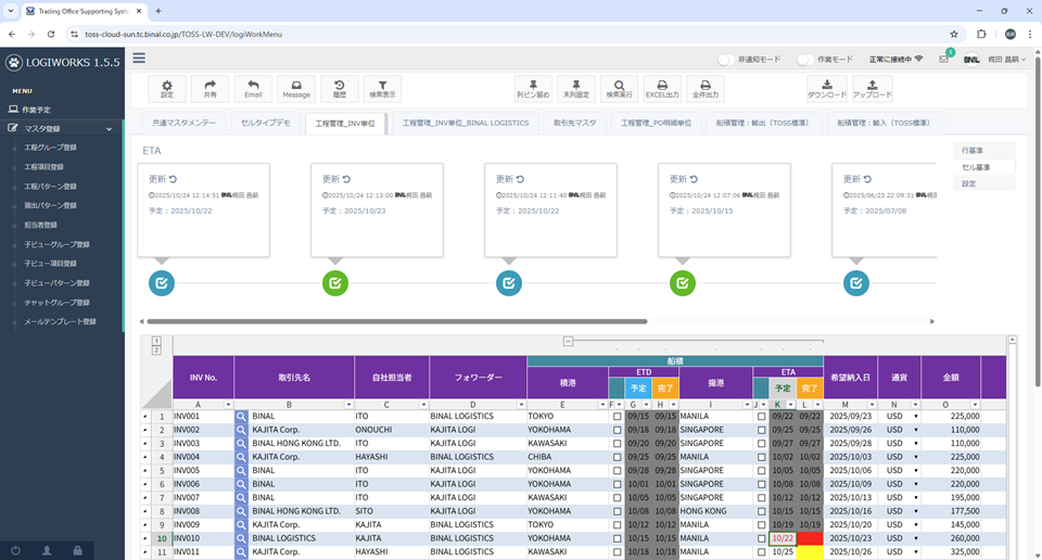 少し変わった例といたしましては、フォワーダー様が船腹予約管理システムのUIとしてTOSS-LOGIWORKSを採用され、入札管理システムと連携して荷主様と船会社様のマッチングに活用されているケースもございます。船積書類作成やETD/ETA等の進捗共有までを一気通貫で提供し、サービスの付加価値の創出にお役立ていただいています。